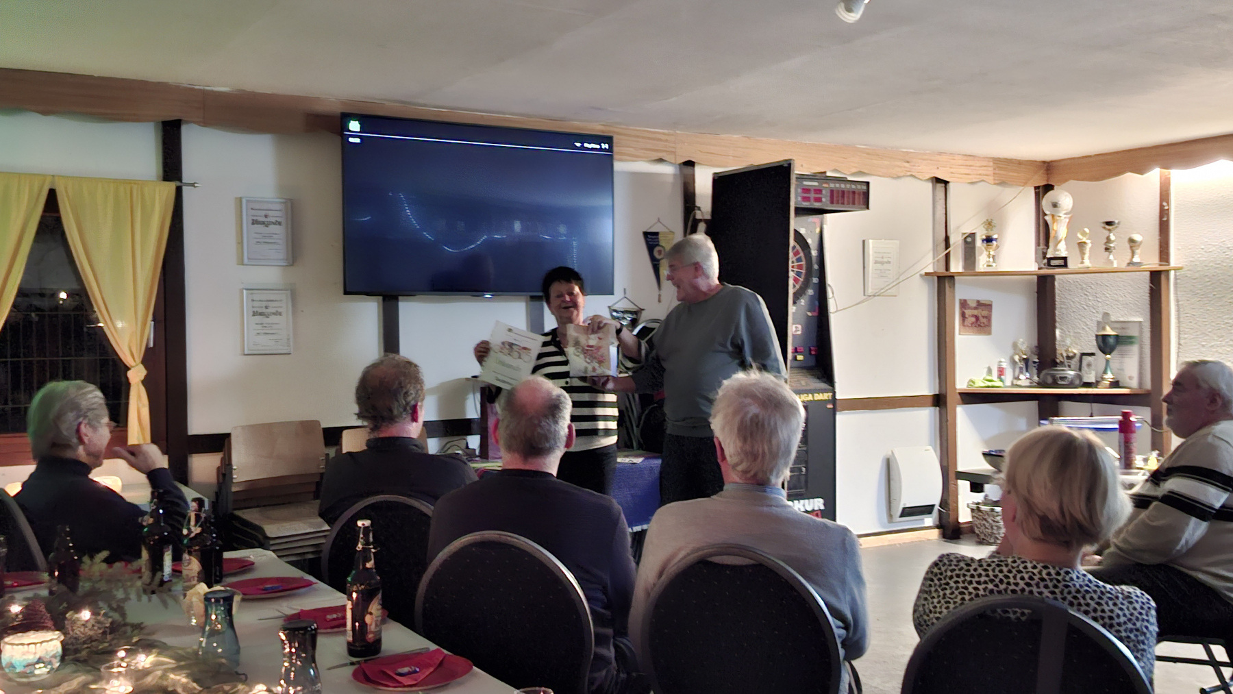 Gespannt waren nun alle auf die Filmvorführung, die pünktlich um 18 Uhr startete. 48 Minuten Zeitreise mit Bildern und Videos sowie Musikuntermalung unserer Aktivitäten von September 2024 bis Oktober 2025. Diese 48 Minuten vergingen wie im Flug und ich darf sagen, es waren wohl alle begeistert. Zum Ende des Films gab es dann noch eine Überraschung. Die Mitglieder mit den meisten Tour-Teilnahmen erhielten eine Urkunde und ein kleines Präsent.