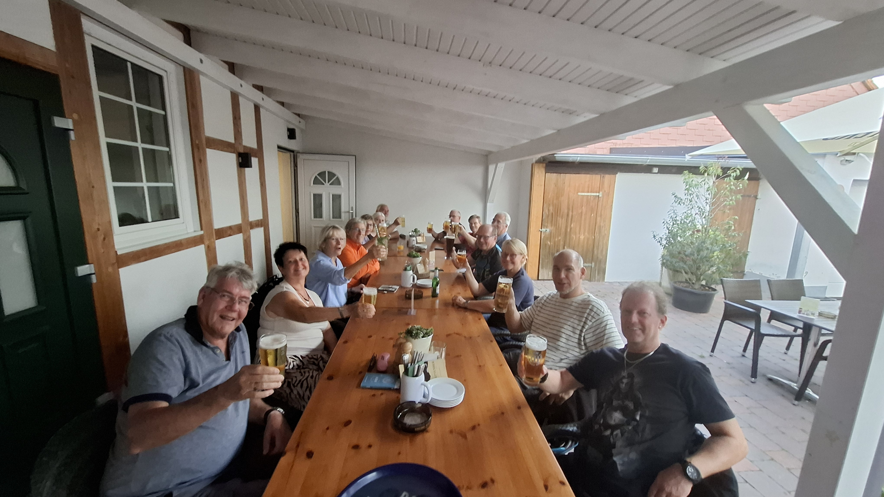 Pünktlich um 18:25 Uhr erreichten wir den Biergarten „Lüddecke“, wo Marlis und Susanna schon auf uns warteten. Jetzt waren alle 14 angemeldeten Teilnehmer komplett. Die Bewirtung klappte vorzüglich, das Essen war klasse und da es noch schön warm war, hätte man auch noch länger verweilen können. Weil aber für 21:00 Uhr Regen vorhergesagt war, planten wir die Abfahrt gegen 20:00 Uhr.