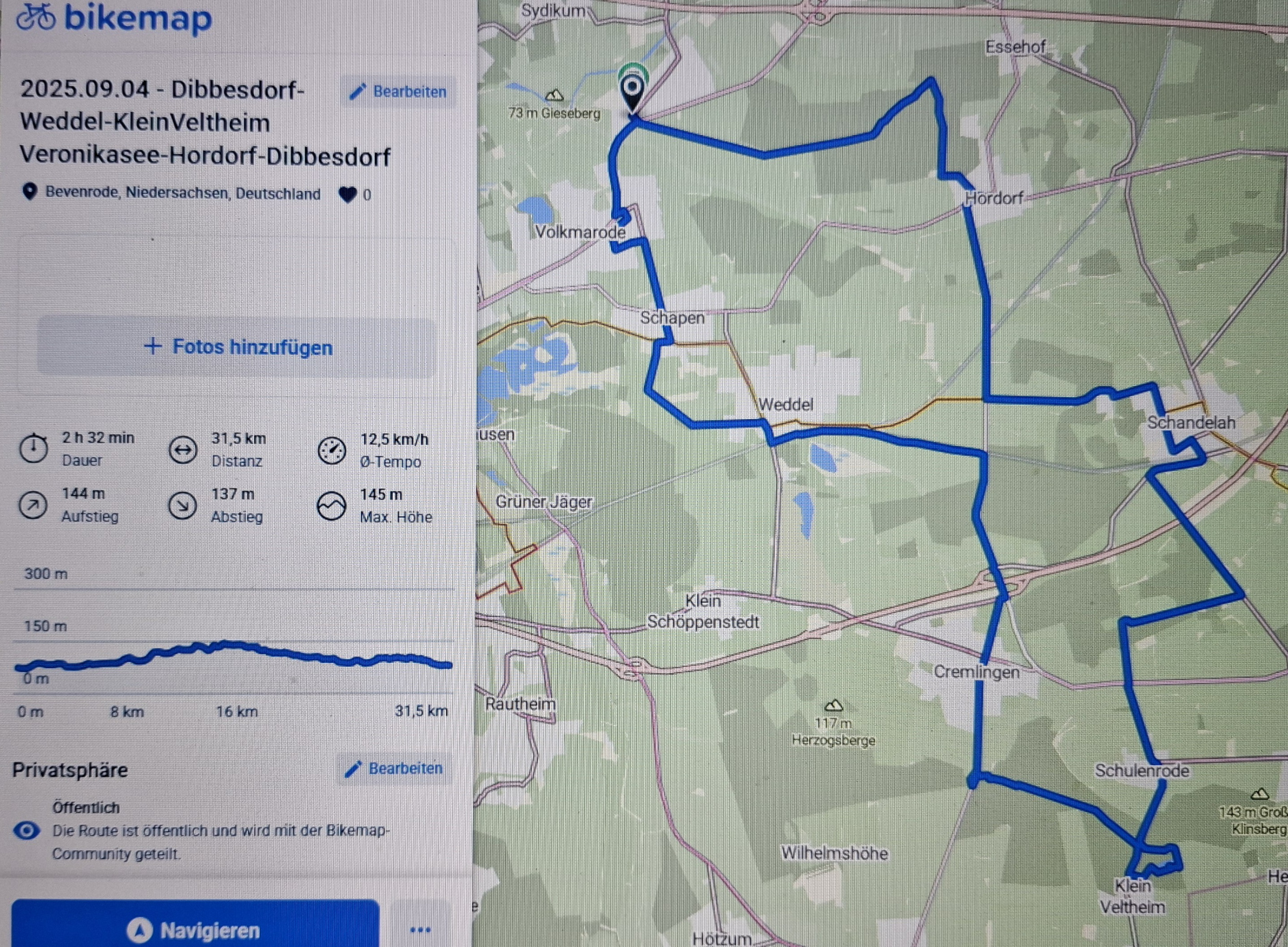 Weiter geht es am 18.9. um 17:00 Uhr am Denkmal in Dibbesdorf. Vor uns liegt eine 27 km-Runde in Braunschweigs Süden, Wendepunkt ist der Südsee. Auf der Rückfahrt kehren wir in Lindenberg in den Biergarten Il Capriccio ein, Plätze sind schon reserviert, bei schlechtem Wetter drinnen.