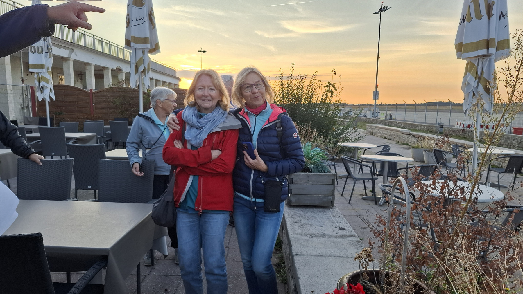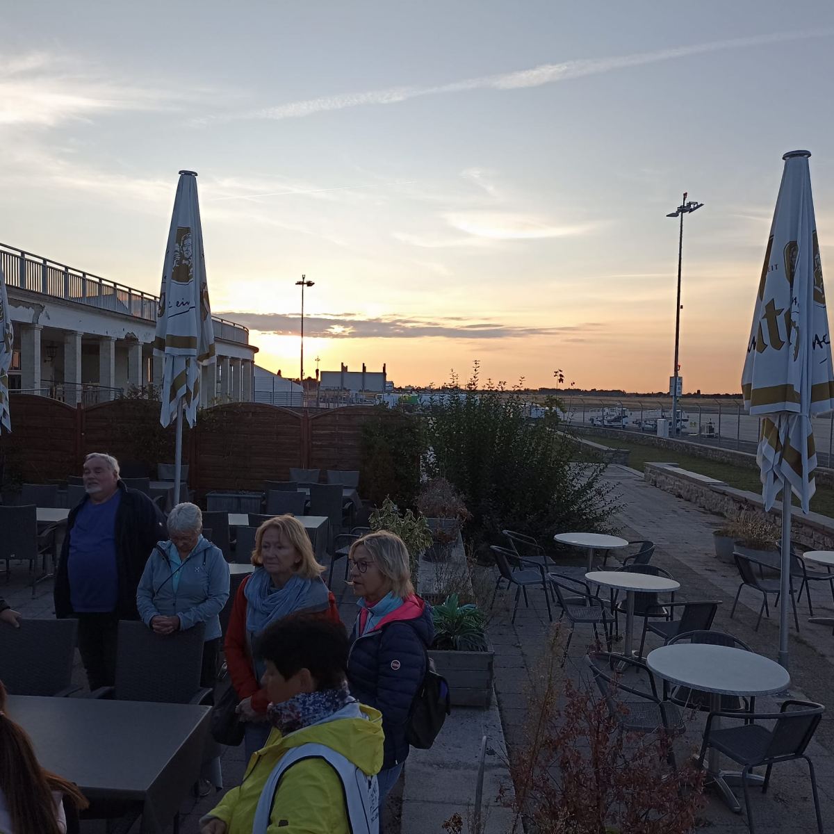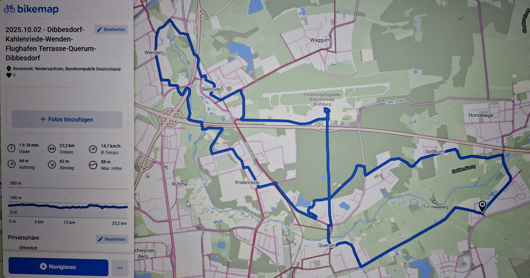 Weiter ging es nach Kralenriede und entlang der Schunter nach Wenden, wo sich Simone verabschiedet hat. In Wendebrück haben wir nach Südosten gedreht und Bienrode ins Visier genommen. Leider hat uns der gesperrte Bahnübergang eine kleine Routenänderung abverlangt. Überpünktlich haben wir um 18:20 Uhr den Flughafen erreicht. Das Il Terrazzo hatte drinnen hübsch für uns eingedeckt. Aber erst einmal sind wir auf die Terrasse. Es gab Infos zu dem neuen Terminal, das seit 19.9.2025 in Betrieb ist. Am 23.9. startete der erste Ferienflieger vom neuen Terminal aus. Nach dem leckeren Essen erhielten wir gegen 20 Uhr einen Grappa und machten uns gut gestärkt auf den Weg Richtung Dibbesdorf. Schon am Flughafen verabschiedeten wir uns von Bettina, in Querum von Jutta und dann vor dem Moorhüttenteich von den 5 Volkmarodern. Um 20:45 Uhr erreichten wir mit kalten Fingern das Denkmal.
