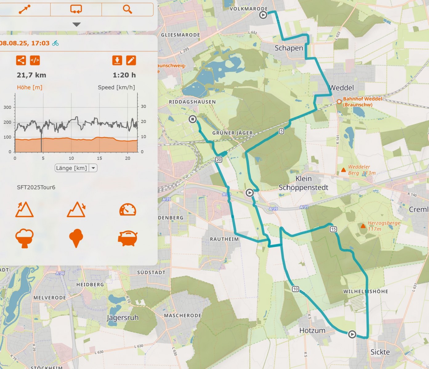 Über das Obersickter Holz und den Reitling geht es nach Rautheim. Von dort über die Bockwindmühle in die Gartenkantine Hopfenkamp. Ende der Reise – Ende der STF2025.