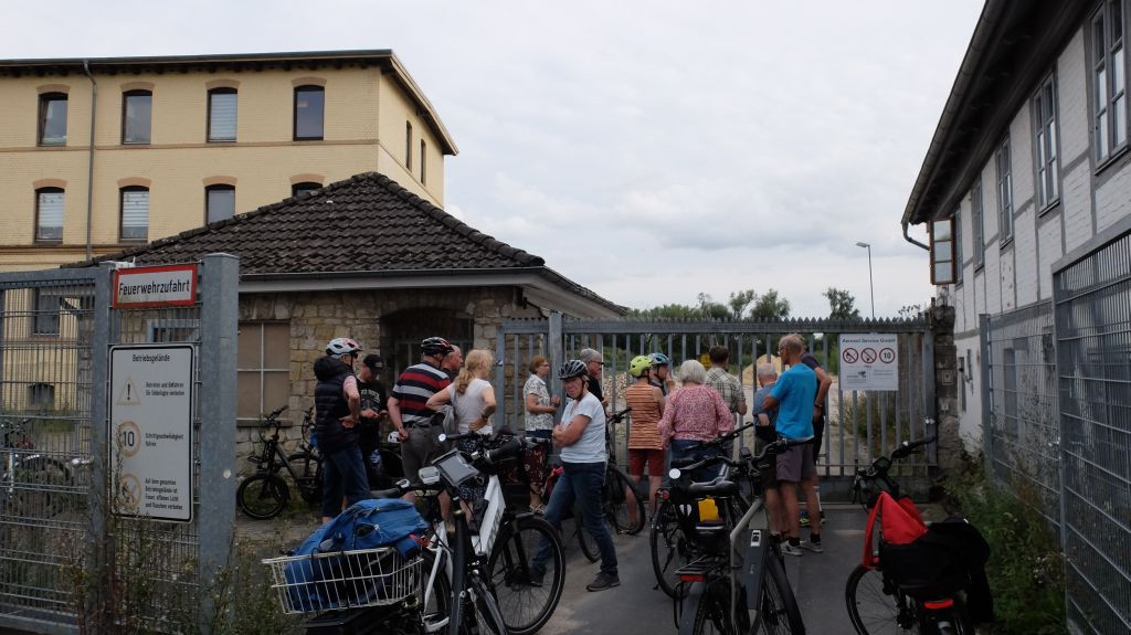 Wolfgang führt uns auf ruhigen Wegen zum Schöppenstedter Turm. Dort ereignete sich im April 2024 ein verheerendes Feuer. Und dazu hat Gert einen Feuerwehrmann eingeladen, der eindrucksvoll das Geschehen schildert. Vom Eintreffen der ersten Einsatzkräfte und den nur schwer zu beherrschenden Verlauf. Nach und nach entzündeten sich weitere Brandquellen (Heizöltanks, Gastank, Flüssiggas- und Fasslager). Zu allem Überfluss war auch noch ein voll beladener Tanklastwagen vor Ort. Das Feuer hatte zwischenzeitlich eine solche Dimension erreicht, dass der Rückzug befohlen wurde. Aus der Ferne hat die Feuerwehr die Lage mit einer Drohne aus der Luft erkundet.