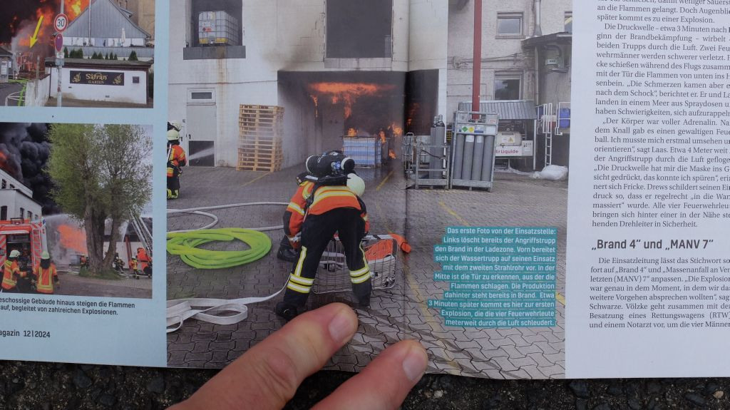 Nachdem der Brand weitestgehend gelöscht war, hat eine Brandwache die nachträglich entstehenden Brände kontrolliert. Ein Bericht zum Einsatz ist in der Ausgabe 12/2024 des Feuerwehr-Magazin zu lesen.
