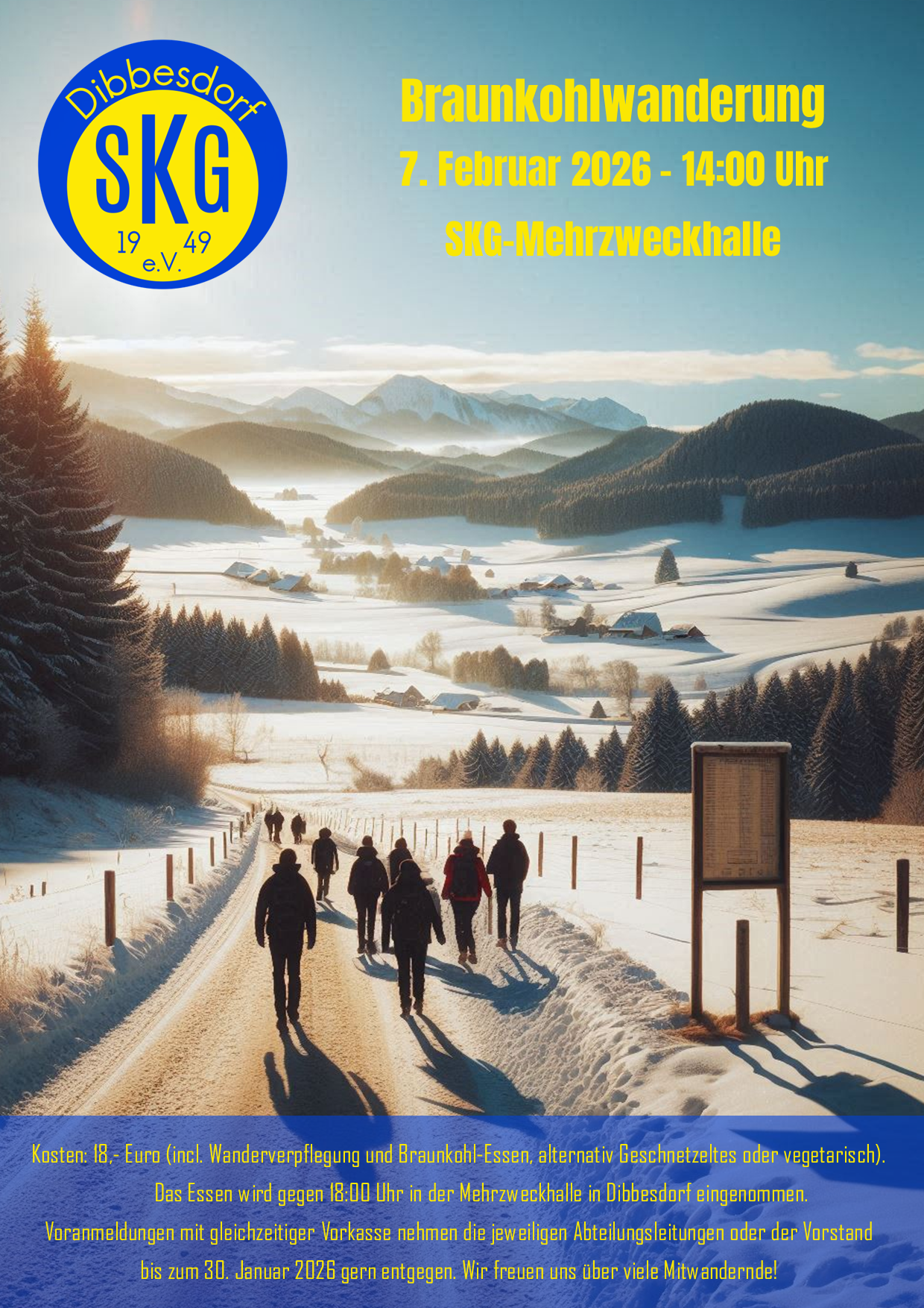 Die Kosten betragen in diesem Jahr 18,- Euro pro Person (incl. Wanderverpflegung und Braunkohl-Essen, alternativ Geschnetzeltes oder vegetarisch). Voranmeldungen mit gleichzeitiger Vorkasse nehmen die jeweiligen Abteilungsleiter/-innen oder auch der Vorstand bis zum 30. Januar 2026 gern entgegen oder meldet euch online an. Über eine rege Beteiligung – so wie beim letzten Mal – würden wir uns sehr freuen.