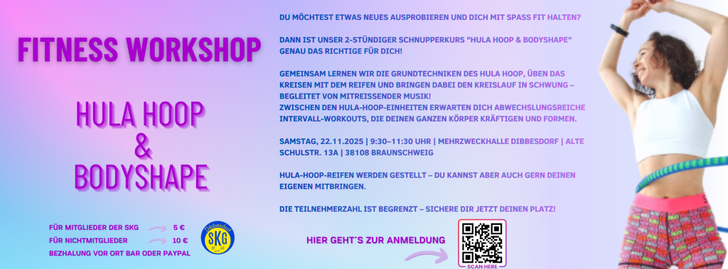 Du möchtest etwas Neues ausprobieren und dich mit Spaß fit halten? Dann ist unser 2-stündiger Schnupperkurs „Hula Hoop Bodyshape“ genau das Richtige für dich! Gemeinsam lernen wir die Grundtechniken des Hula Hoop, üben das Kreisen mit dem Reifen und bringen dabei den Kreislauf in Schwung – begleitet von mitreißender Musik! Zwischen den Hula-Hoop-Einheiten erwarten dich…